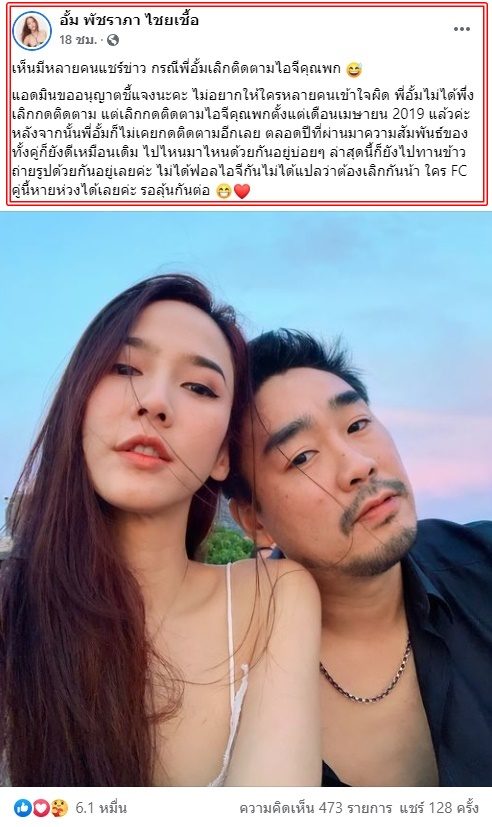 เมื่อไม่นานมานี้ เพจอั้ม พัชราภา ไชยเชื้อ มีผู้ติดตาม 2.1 ล้านคน โพสต์รูปภาพ พร้อมชี้แจงกรณีที่อั้มเลิกติดตามไอจีไฮโซพก ทั้งยังยืนยันว่าทั้งคู่ไม่ได้เลิกกัน ด้วยข้อความระบุว่า “เห็นมีหลายคนแชร์ข่าว กรณีพี่อั้มเลิกติดตามไอจีคุณพก ? แอดมินขออนุญาตชี้แจงนะคะ ไม่อยากให้ใครหลายคนเข้าใจผิด พี่อั้มไม่ได้พึ่งเลิกกดติดตาม แต่เลิกกดติดตามไอจีคุณพกตั้งแต่เดือนเมษายน 2019 แล้วค่ะ