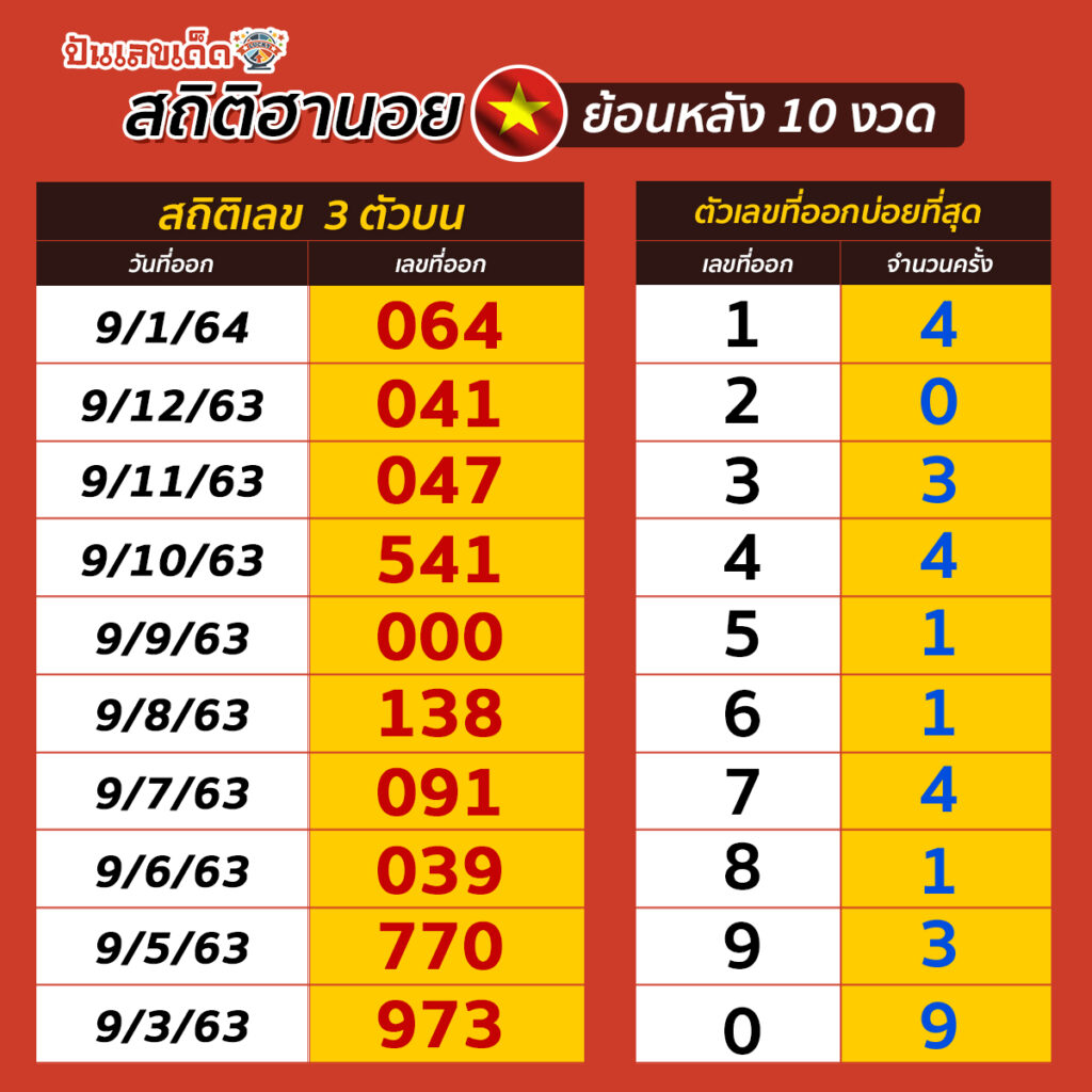 มาแล้วจ้า ! ปันเลขเด็ด ขอนำเสนอสถิติฮานอย เลขสวย ๆ ย้อนหลัง 10 งวด ให้เซียนหวย ที่ต้องการแนวทางฮานอย หรือต้องการเจาะเลขเด็ดฮานอย นำสถิติที่หวยฮานอยจะออกในงวดล่าสุด ไปวิเคราะห์ มาดูกันว่าผลหวยฮานอยหรือหวยเวียดนามย้อนหลัง จะมีเลขไหนที่ออกบ่อยที่สุด ไปดูกันจ้า