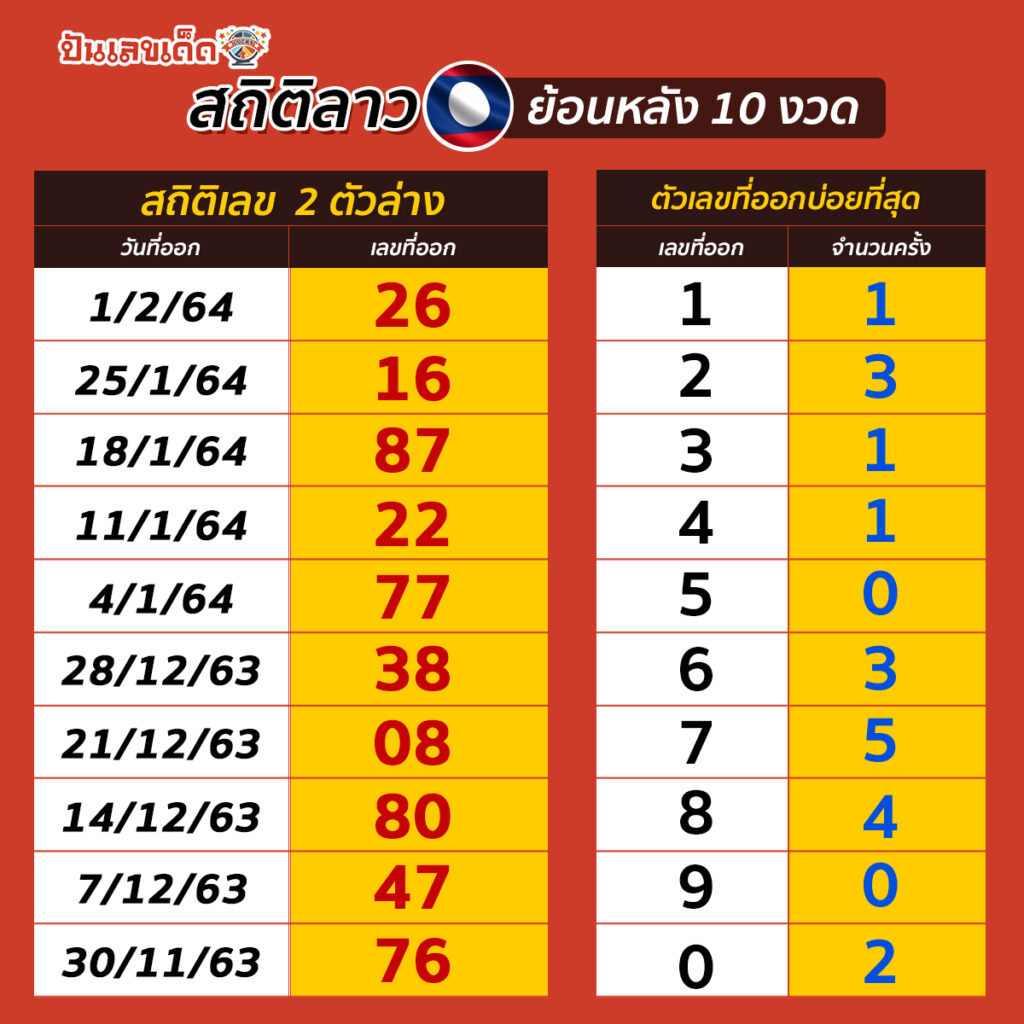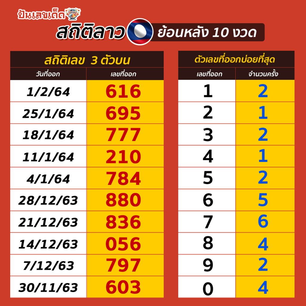 แนวทางลาว สถิติลาว วันจันทร์ ย้อนหลัง 10 งวด